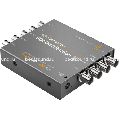 Mini Converter SDI Distribution 4K имеет восемь выходов для вывода одного регенерированного SDI-сигнала на несколько устройств. Есть возможность переключения между SD-SDI, HD-SDI, 3G-SDI и 6G-SDI, предусмотрена поддержка ASI, дополнительных данных и форматов со встроенным звуком.
