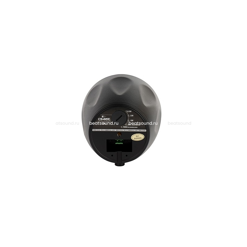 В данной модели используется двухполосная конфигурация. Вуфер (НЧ-СЧ динамик) имеет размерность 4” (101mm), изготовлен из легкого литого полипропилена на гибком резиновом подвесе. Купольный твитер (ВЧ динамик) изготовлен из шёлка и имеет размер 1” (24,5mm). Корпус черного цвета данной модели имеет очень компактный размер, современный элегантный дизайн и изготовлен из высококачественного ABC пластика стойкого к воздействию солнечного света и пыли. Лицевая часть динамика закрыта декоративной металлической сеткой, окрашенной в цвет корпуса акустической системы. Благодаря небольшому размеру CVGaudio CS416TBl можно незаметно расположить, спустив с чернового потолка на тростках до уровня потолочных коммуникаций, коробов вентиляции или шинопровода освещения. Данная модель может работать как в составе 100V трансляционной системы, так и в низкоомном режиме (low-impedance). Для выбора режима работы на обратной стороне корпуса, под декоративной крышкой, имеется специальный селектор, с помощью которого можно выбрать одну из четырёх доступных мощностей (3,75/7,5/15/30W) в трансляционном 100V режиме работы или перевести в акустическую систему низкоомный режим (для данной модели 16ohm).