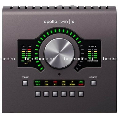 В дополнение к двум микрофонным предусилителям с моделированием Unison, Apollo Twin X предлагает выход для наушников и инструментальный вход Hi-Z. Кроме того, с двумя линейными выходами, оптическим входом и выходом ADAT / SPDIF, расширенной мониторной секцией и встроенным микрофоном Talkback, Apollo Twin X может стать мощным центром вашей профессиональной студии.