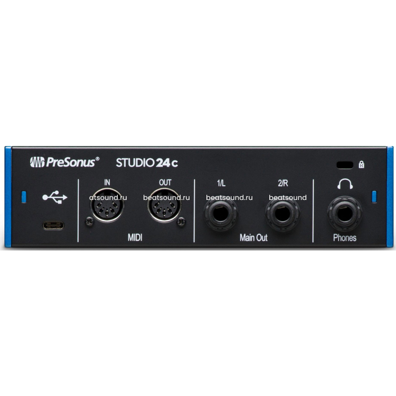 Аудио интерфейс Studio 24C 2х2 оснащен комбинированными микрофонными / инструментальными / линейными входами с фантомным питанием + 48 В для конденсаторных микрофонов; балансными 1/4-дюймовыми TRS линейного уровня основными выходами, портом USB-C, выходом для наушников, регулятором выходного уровня и регулятором Mixer, объединяющим в себе аналоговый вход и компьютерное воспроизведение для прямого мониторинга с низкой задержкой. Наличие встроенного MIDI интерфейса позволяет подключать сопутствующее MIDI оборудование, такое как: клавишные, звуковые модули или control surface.