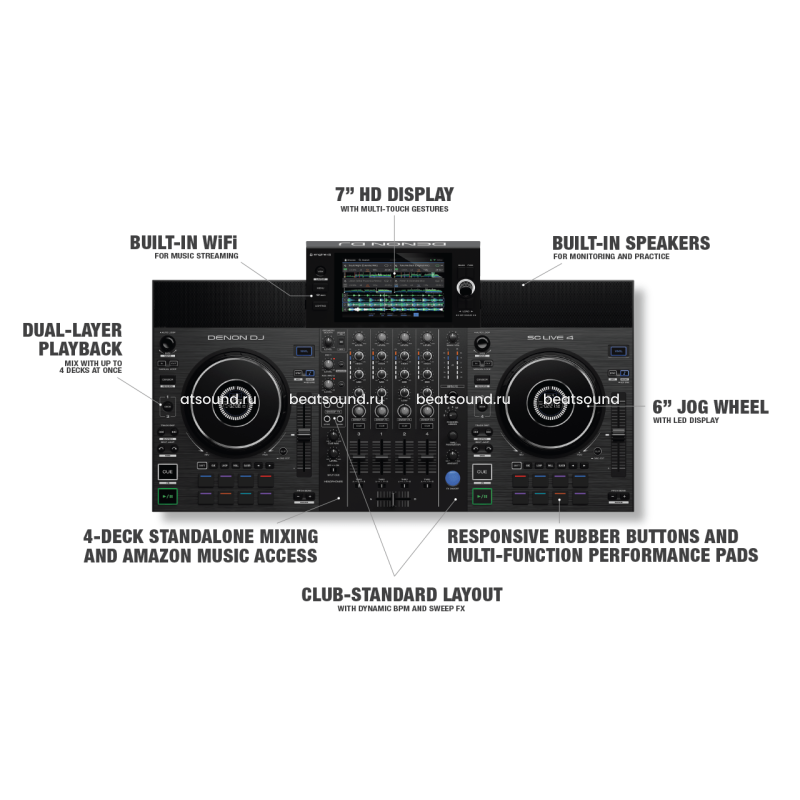 Denon SC Live 4 - автономная DJ-система с 4 деками и Wi-Fi. Интеграция SC LIVE 4 с Amazon Music Unlimited и другими популярными потоковыми сервисами дает диджеям мгновенный доступ к более чем 100 миллионам песен в качестве CD. Благодаря встроенному Wi-Fi и молниеносному встроенному анализу песен теперь вы можете исполнить полный диджейский сет, не приобретая и не готовя музыку заранее. SC LIVE 4 работает под управлением Engine DJ, той же ведущей автономной операционной системы для диджеев, которая обеспечивает выступления без ноутбуков на самых больших сценах и в диджейских будках по всему миру. При включенном «Компьютерном режиме» SC LIVE 4 можно использовать в качестве специального программного контроллера DJ для Serato DJ (включая лицензию Pro) и совместим с Virtual DJ (требуется дополнительная лицензия). Эта универсальность дает диджеям несколько вариантов исполнения, которые они предпочитают. LIVE 4 сочетает в себе мощь стандартной клубной модульной установки с компактным и интуитивно понятным автономным DJ-контроллером с 4 деками. Благодаря встроенному Wi-Fi, 7-дюймовому сенсорному экрану с поддержкой нескольких жестов и 3 слотам для мультимедиа, SC LIVE 4 раскрывает творческие живые выступления, используя комбинацию сохраненных мультимедиа и источников потоковой передачи музыки. Мощные встроенные динамики предлагают идеальное звуковое решение для прямых трансляций, тренировок, создания контента и личного мониторинга во время живых выступлений. Специальная ручка регулировки громкости и переключатель включения/выключения обеспечивают полный контроль для удовлетворения потребностей любого концерта, позволяя вам легко брать будку с собой, куда бы вас ни привела ваша диджейская карьера. Выделенные кнопки Layer обеспечивают быстрый доступ к элементам управления каждой из 4 игровых дек с волновыми формами, расположенными в порядке каналов на полноцветном сенсорном экране. Компьютерный режим позволяет использовать SC LIVE 4 в качестве полнофункционального программного контроллера DJ для Serato DJ (включая лицензию Pro) и Virtual DJ (требуется дополнительная лицензия). Высококачественные встроенные эффекты, включая 4 управляемых регулятором канала Sweep FX и 13 полностью настраиваемых и назначаемых параметров BPM FX с отдельной секцией управления эффектами и кнопкой включения с подсветкой. Благодаря встроенному Wi-Fi SC LIVE 4 соединяет вас с вашим любимым сервисом потоковой передачи музыки или личным облачным хранилищем без привязки к компьютеру. Войдите в свою потоковую учетную запись непосредственно на устройстве для мгновенного доступа к крупнейшим в мире музыкальным коллекциям. В дополнение к революционной интеграции с Amazon Music Unlimited, SC LIVE 4 предлагает широкий спектр вариантов потокового вещания, включая Beatport Streaming, Beatsource, SoundCloud GO+ и TIDAL. Независимо от того, какой музыкальный жанр вы предпочитаете, SC LIVE 4 поможет вам. В дополнение к параметрам потоковой передачи вы можете легко получить доступ к своей личной музыкальной библиотеке и спискам воспроизведения, используя слот для SD-карты и 2 входа USB. Или просто подключите свою учетную запись Dropbox для удаленного доступа к своей личной музыкальной коллекции из любой точки мира. Мощные встроенные динамики с регулятором громкости и выключателем позволяют легко практиковаться или выступать в любое время и в любом месте. Идеально подходит для использ
