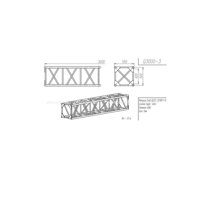 Прямой модуль квадратной конфигурации длиной 3000мм, 550x550мм, d50x3 \ d28x2мм. Основная труба сплав АД31т1