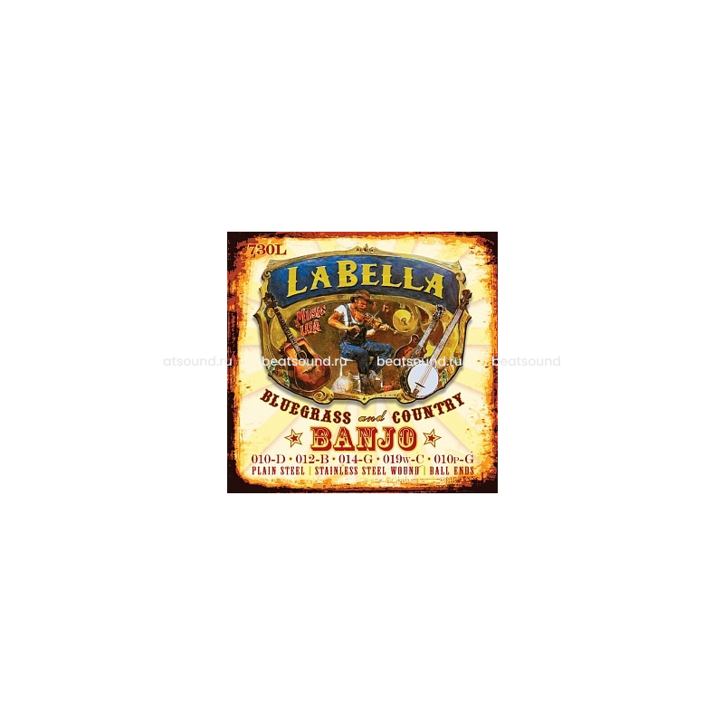 730L-BE Light Комплект струн для 5-струнного банджо (наконечник шарик). 1, 2, 3 и 5 струны - сталь, 4 - посеребренная оплетка. 10p(РЕ)-12p(СИ)-14p(СОЛЬ)-19w(ДО)-10p(СОЛЬ) La Bella США