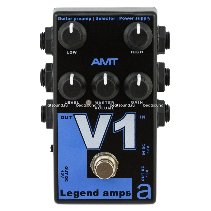 AMT Electronics V1 (как и F1) поставляется с сетевым адапетром на 12В (в отличии от других преампов этой серии) и имеет встроенный разветвитель на 3 разъёма для подключения внешних гитарных эффектов или преампов LA серии, питающихся от 12В.