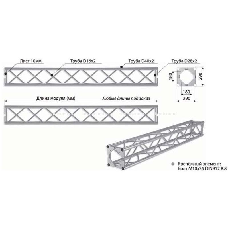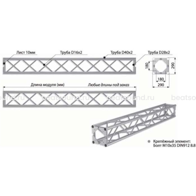 Прямой модуль квадратной конфигурации длиной 2500мм, 290x290мм, d40x2 \ d16x2мм. Крепежный размер 180х180мм, М10. Рисунок перемычек круговой.