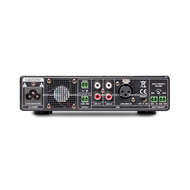 Оснащен bluetooth-приемником, USB-портом для проигрывания MP3-файлов из flash-диска, а также двумя микрофонными входами (с функцией talkover с разъемом TRS на фронтальной панели и снабженный фантомным питанием с разъемом XLR комбинированный mic/line вход на задней панели), линейным стереовходом для подключения источника аудио-сигнала, а также стереовыхдом для передачи линейного сигнала на следующий усилитель (каскадирование) и двухполостным темброблоком. При отключении от сети 220В может работать от резервной сети 24В. Также оснащен приоритетным линейным и 100В входами на задней панели. Комплектуется ИК-пультом дистанционного управления.