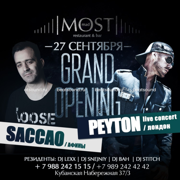 Развлечения. Каждый вечер предполагается работа диджея. Трёх часовой сэт в стиле lounge, переходящий в deep- house. Резидентами заявлены опытные профи ночных растанцовок, как то: Dj Lexx, Dj Andrey Snejniy, Dj Stitch и Dj Bah. Команда сильная и проверенная в банкетных баталиях. Раз в месяц, как обещали рестораторы, гостей МоSта будут баловать приезжей звездюлькой и обширным перформансом в рамках полноценной вечеринки. Именно с этим, технически помогли специалисты компании «BEAT SOUND»! Как на картину Banksy, в ресторан вписался комплект английской акустики Martin Audio, раскачиваемый оконечниками Lab.Guppen. Для диджеев мы поставили их любимый сэт из двух Pioneer CDJ 2000 Nexus и пульта Pioneer DJM 900 Nexus. Световой парк мы полностью заполнили приборами брэнда BS LIGHTING, под управлением системы Sunlite. В системе фонового озвучивания мы использовали любимые настенные акустические системы JBL CONTROL 25T AV WH. Все готово к приезду клубных артистов и диджеев.